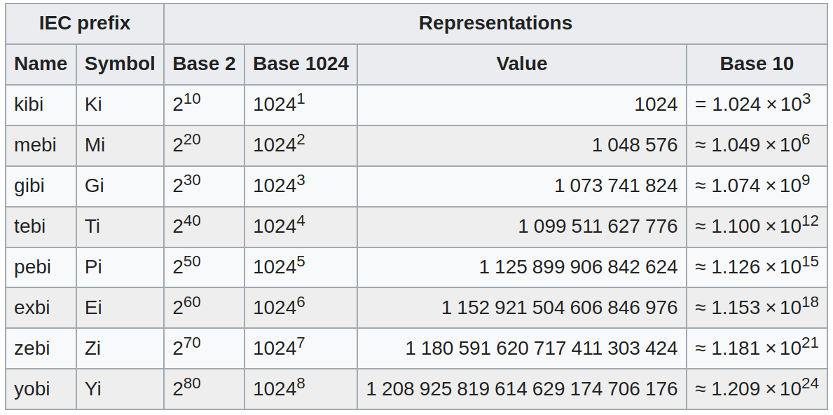 Các đơn vị mới (chuẩn IEC) sẽ là kibibyte (KiB), mebibyte (MiB), gibibyte (GiB)…. Các đơn vị (chuẩn SI) kilobyte (kB), megabyte (MB), gigabyte (GB)… sử dụng tỉ lệ 1000.