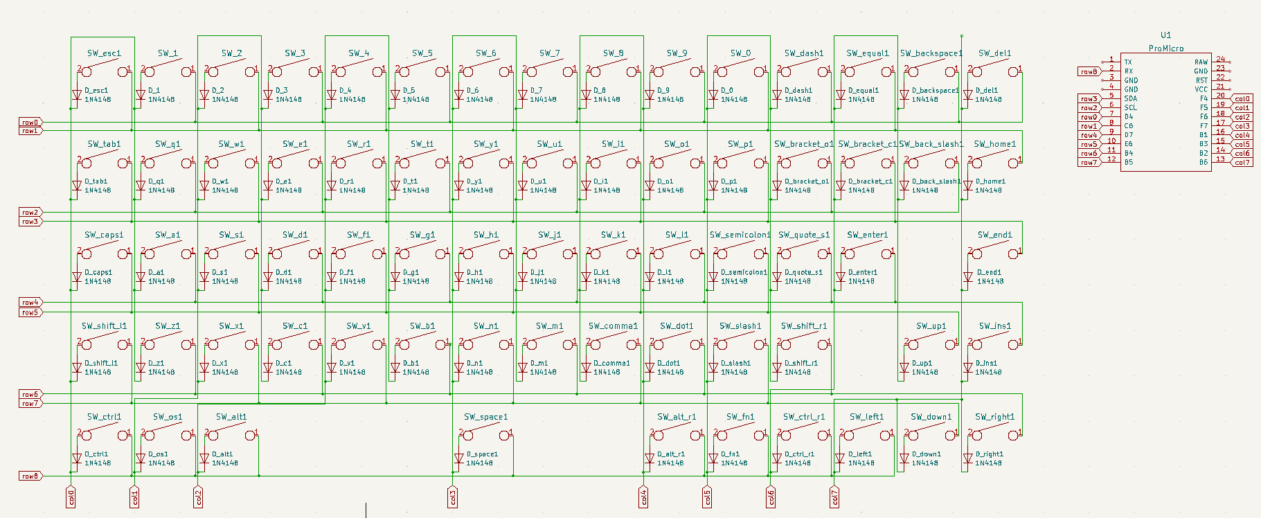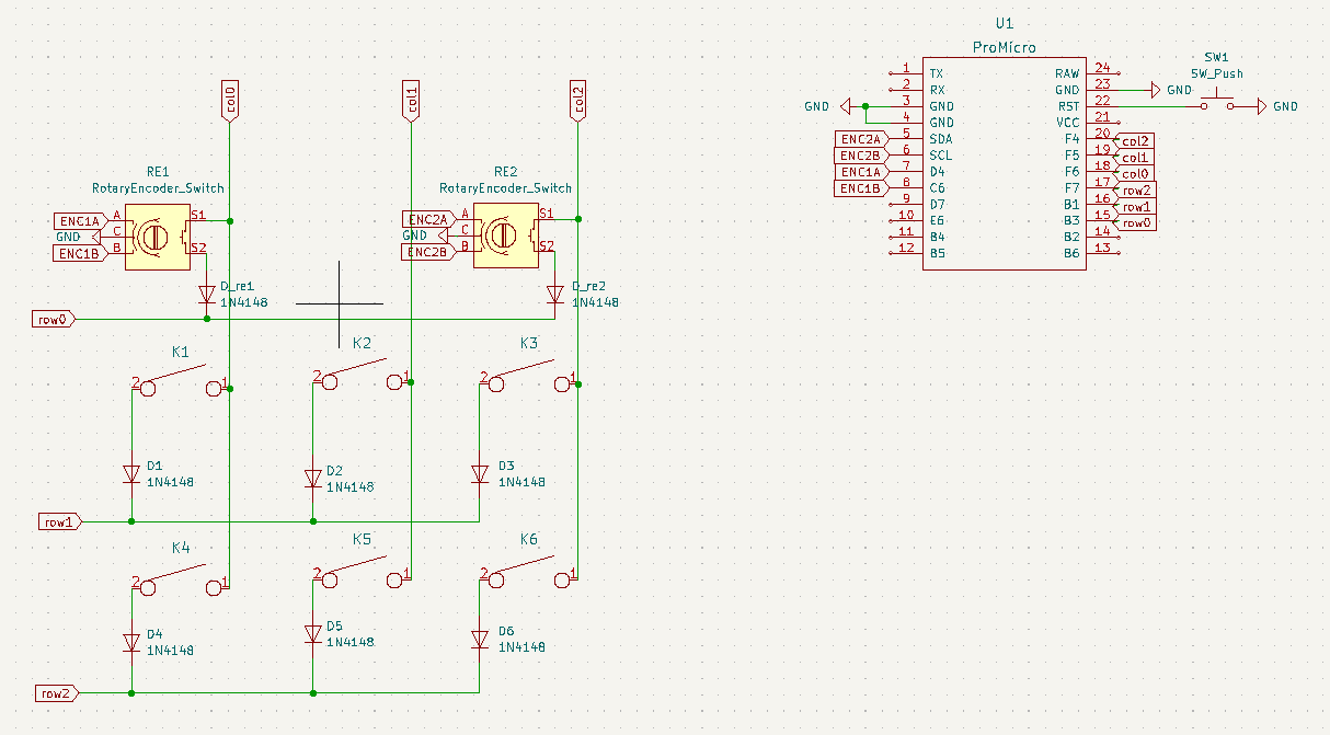Để bắt đầu vẽ mạch, cần chọn vi điều khiển trước. Sau khi tham khảo thì mình chọn ProMicro vì nó sẵn có trên mấy sàn thương mại điện tử. Phần mềm mình dùng để vẽ mạch là KiCad. Nếu bạn muốn tìm hiểu KiCad có thể bắt đầu từ video này, rất chi tiết dễ hiểu. Một số linh kiện (symbol + footprint) không tồn tại sẵn trong KiCad, thì phải google để add thêm vào.